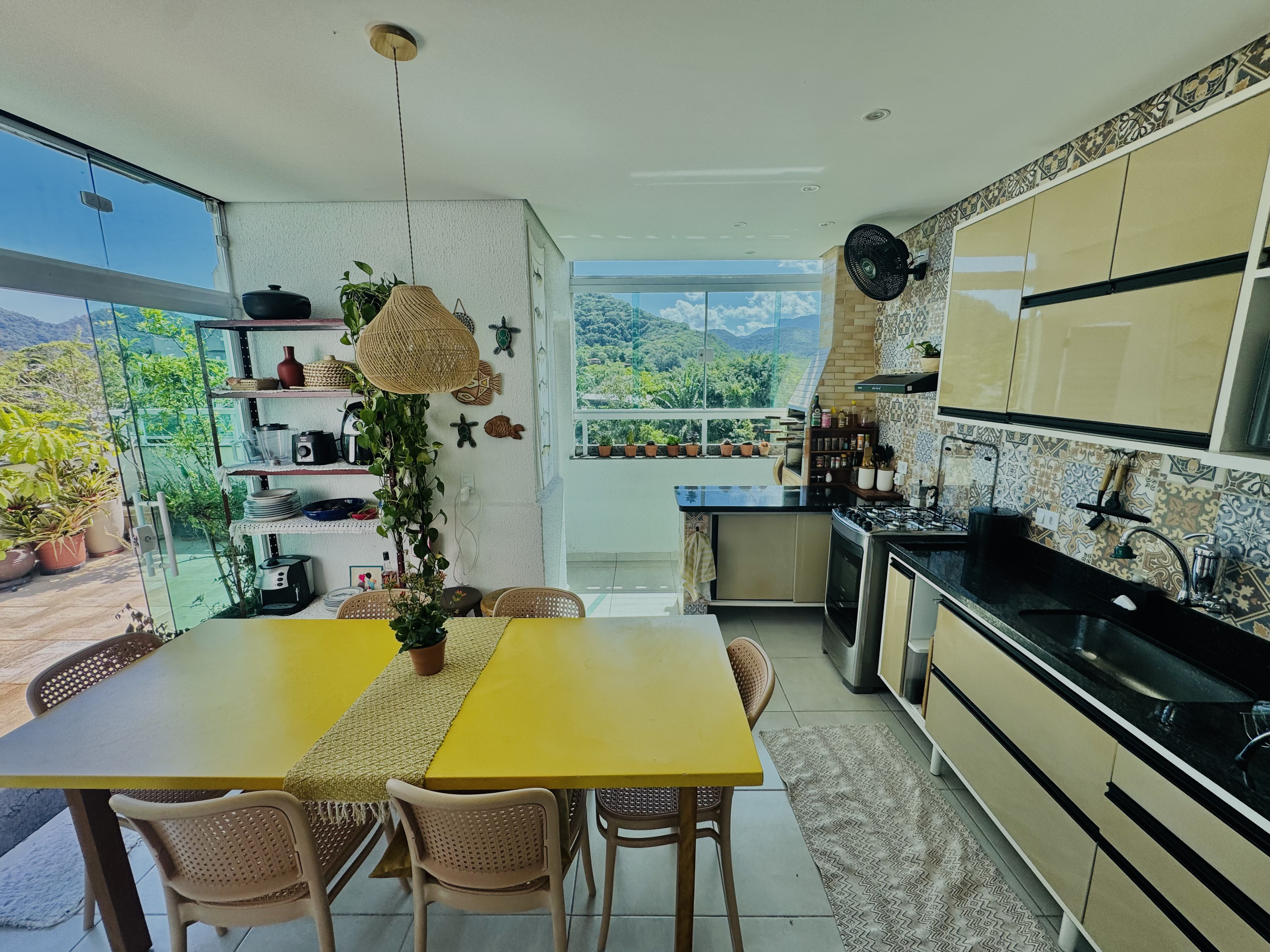 A área social é acolhedora e bem iluminada, com sala ampla e integrada, proporcionando um ambiente convidativo e sofisticado. A cozinha conta com armários planejados e excelente funcionalidade, além de uma vista panorâmica deslumbrante para a mata — um verdadeiro privilégio.