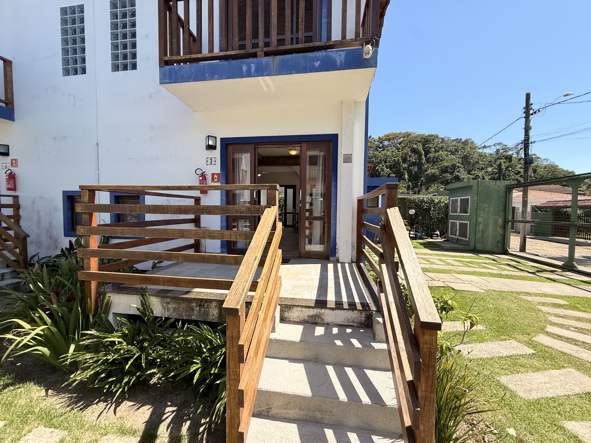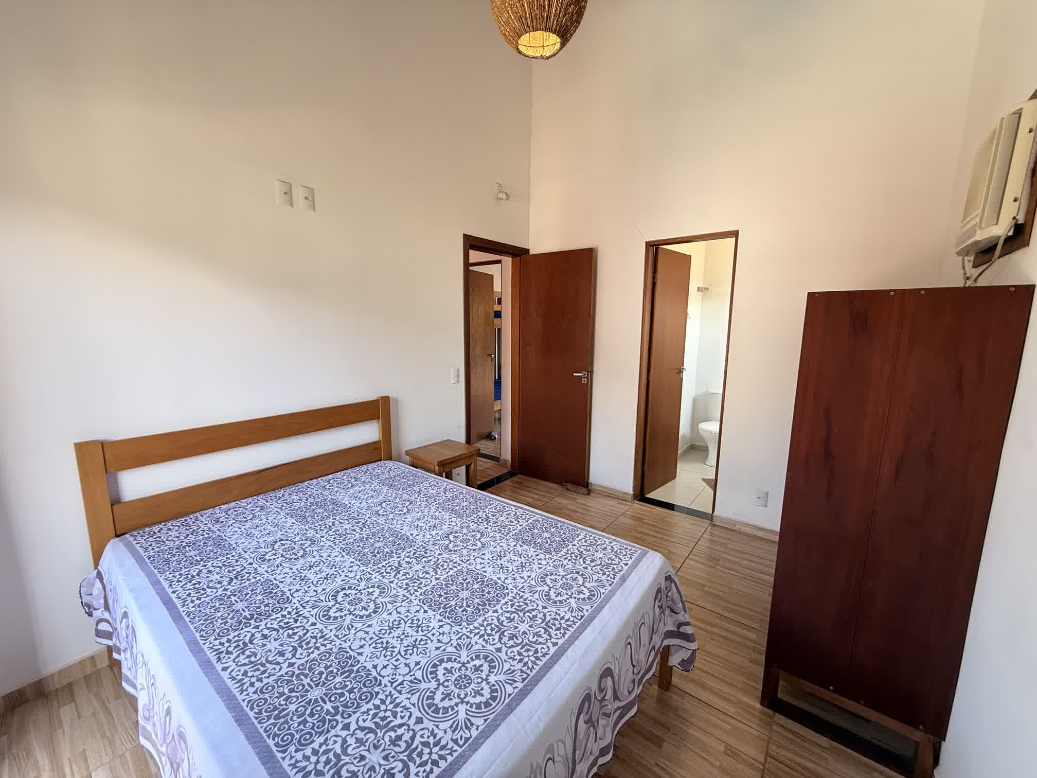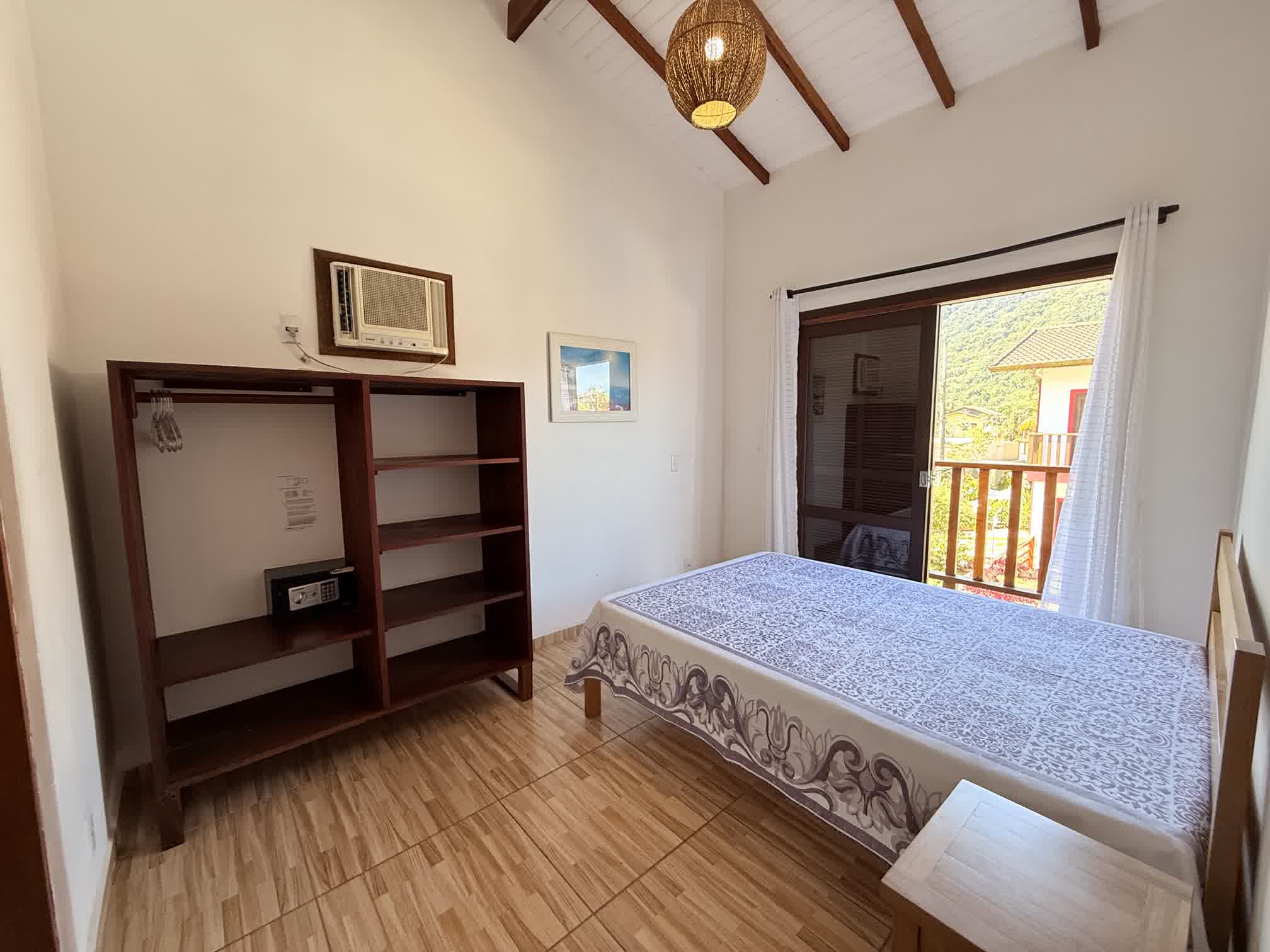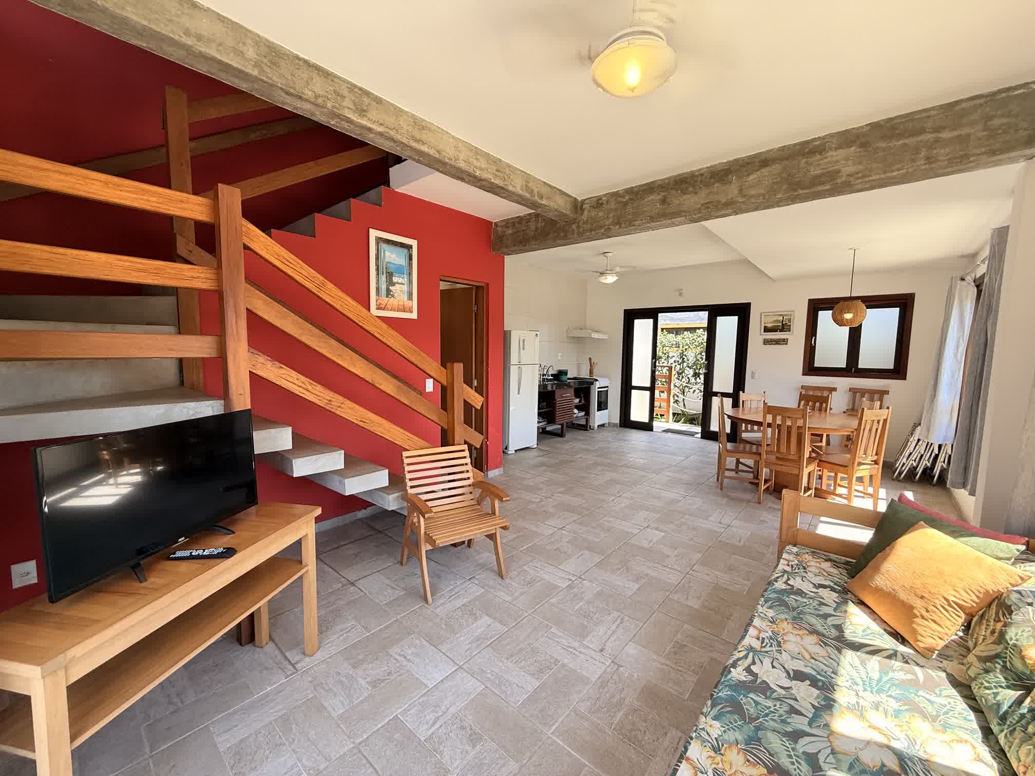 Casa térrea, uma com 1 suíte com ar condicionado e banheira com hidromassagem, caranda na frente e deck privativo nos fundos e outra com 2 quartos. Sala e cozinha integradas e equipadas com ventiladores de teto. Acomodam de 4 a 6 pessoas.
