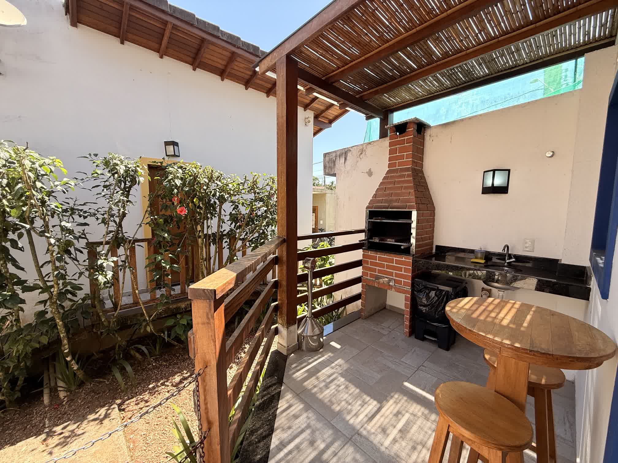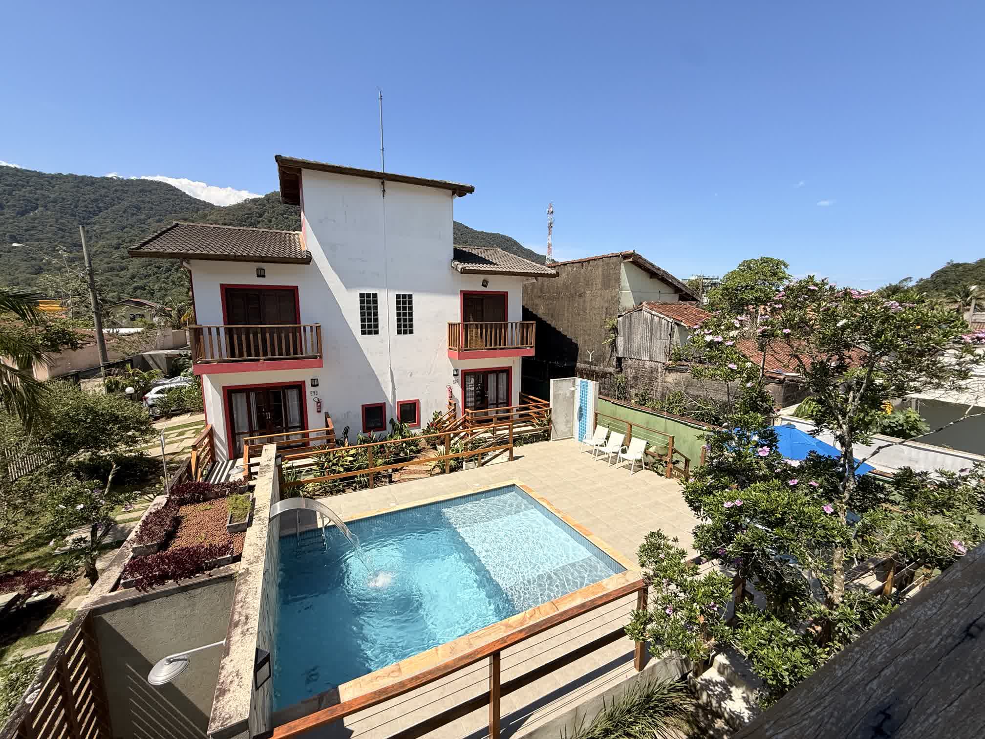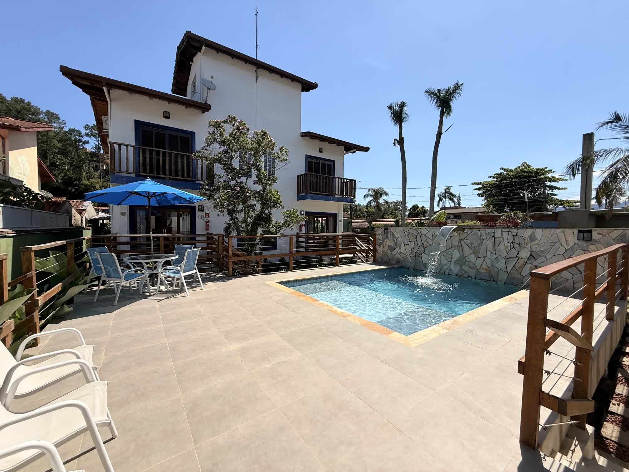 O terreno conta com uma área total de 912m² sendo 401,85m² de área construída. Com uma belíssima área verde externa, sistema de segurança, deck com piscina e solarium, duchas externas, churrasqueiras privativas e ar condicionado e vetiladores de teto nas acomodações. Conheça mais detalhes: